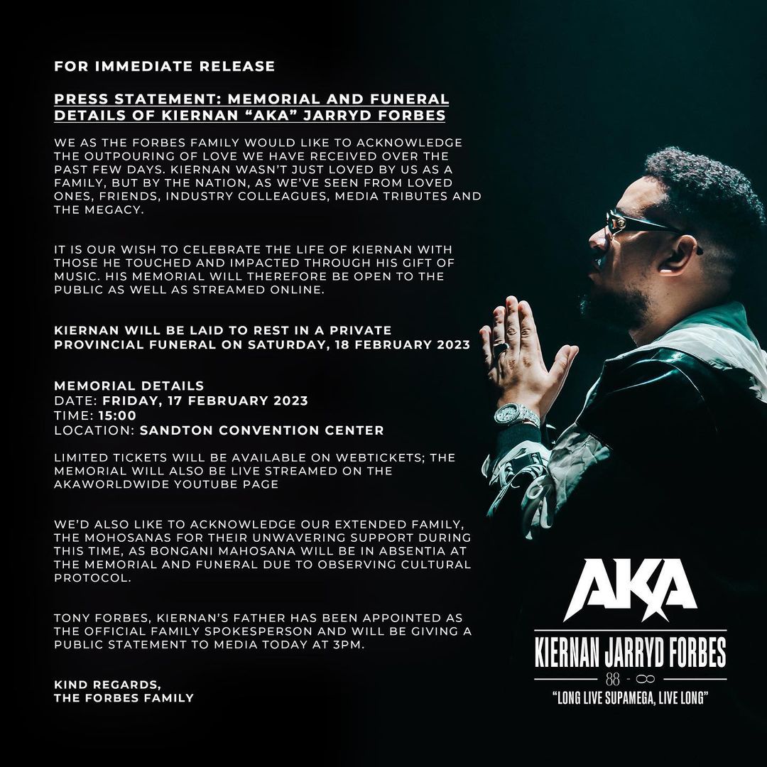 The family of Kiernan Jared Forbes “AKA” has released details of the funeral and memorial of the late rapper.