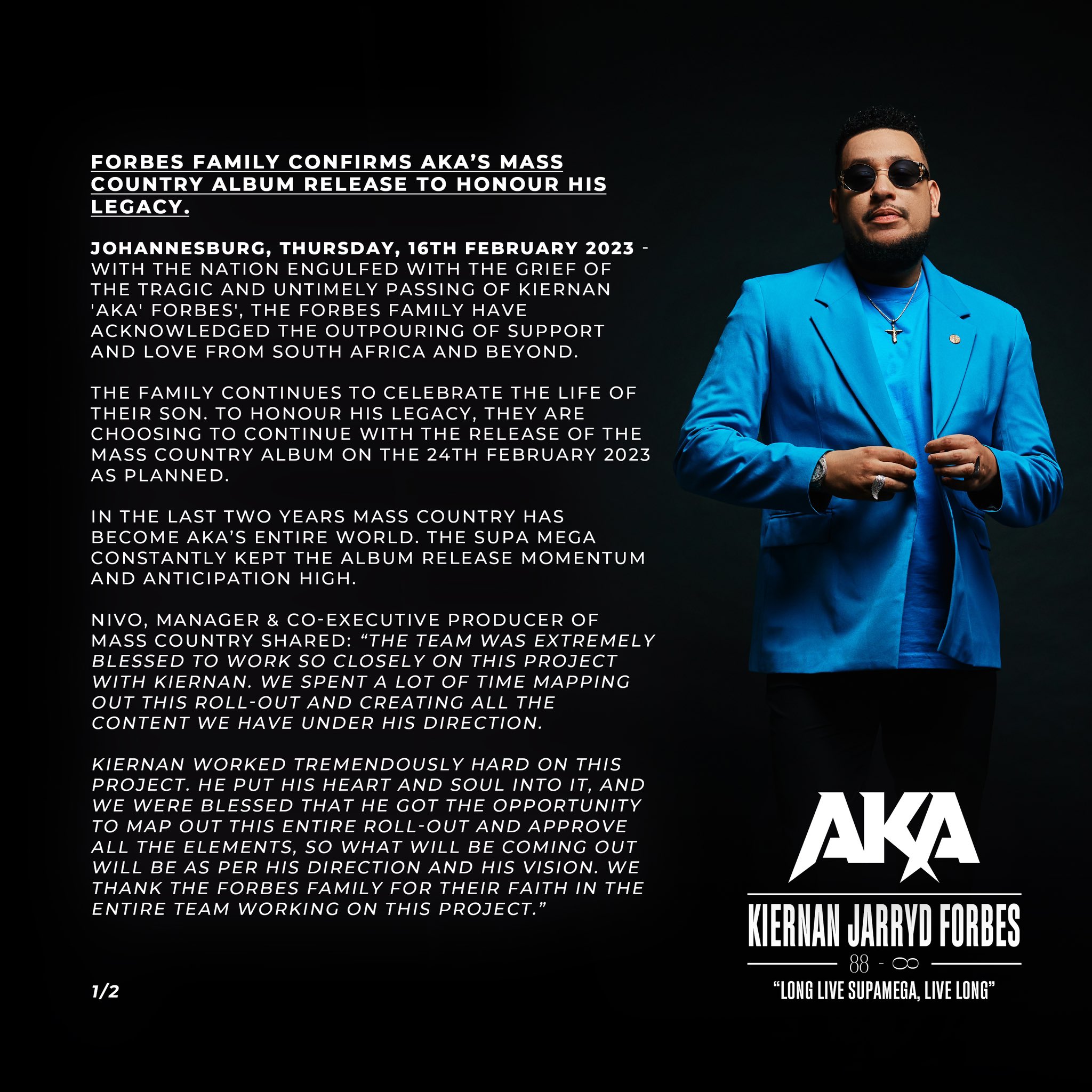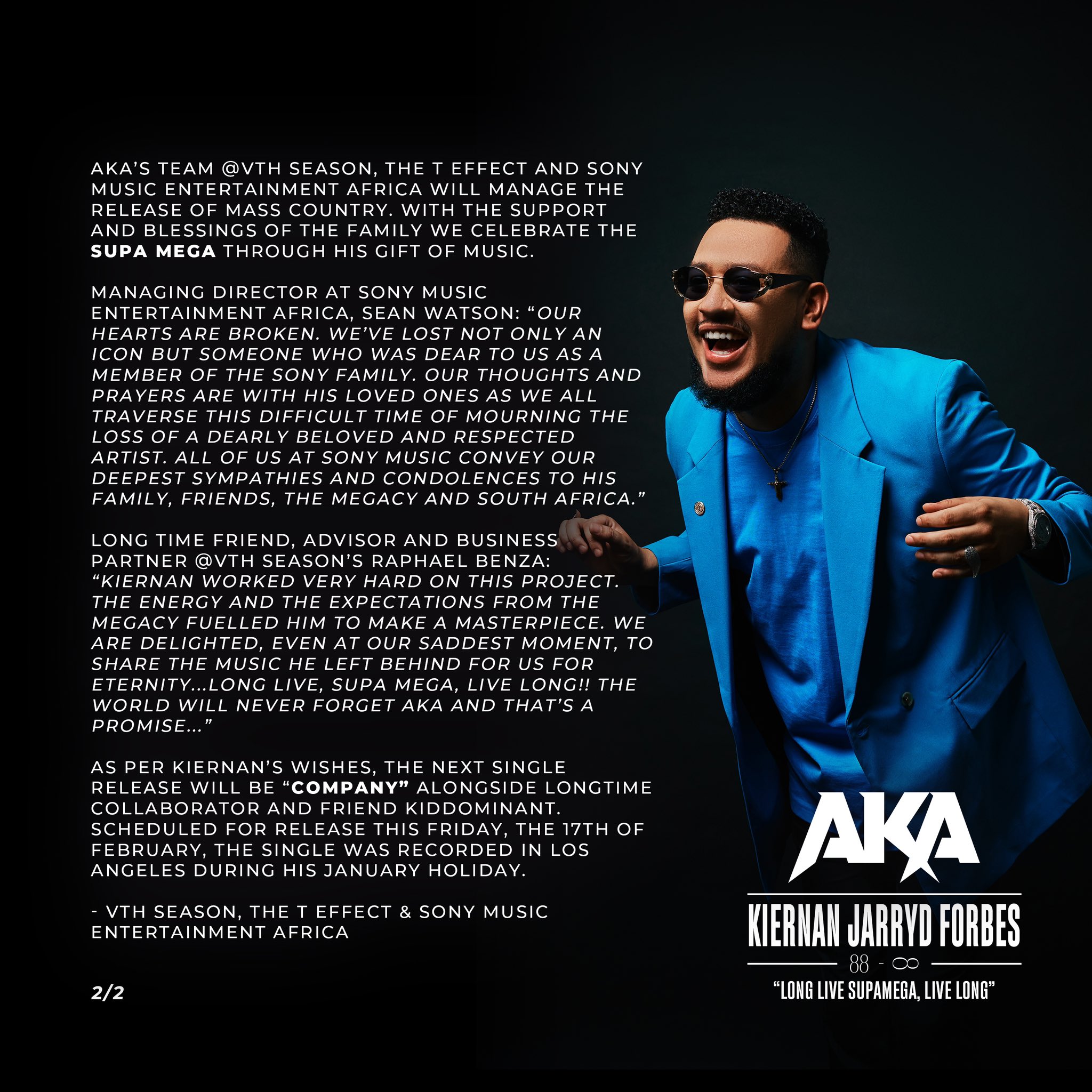 “Kiernan worked very hard on this project. The energy and the expectations from the Megacy fuelled him to make a masterpiece. We are delighted, even at our saddest moment, to share the music he left behind for us for eternity … Long Live, Supa Mega, Live Long! The world will never forget AKA and that’s a promise …” said friend and business Partner @Vth Season Rapheal Benza.