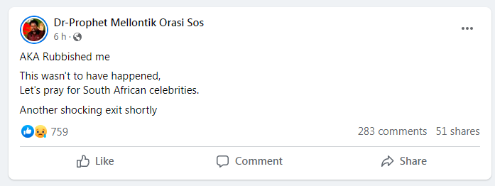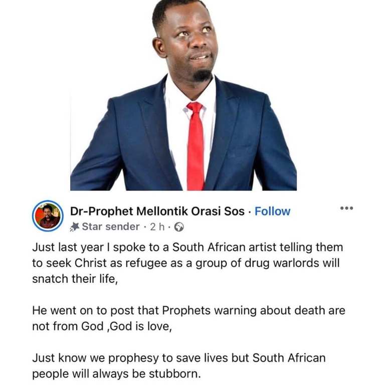 Controversial prophet, Mellontik Orasi who saw the deaths of Shona Ferguson and many others, has broken his silence following the passing of Kiernan Jarryd Forbes, known professionally as AKA.