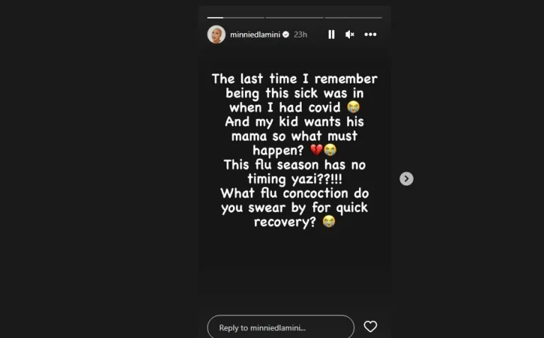She has a strong Flu that is making her so down and in need of a severe concussion. Here is Minnie Dlamini’s post about her sickness and how much she needs medication. The last time l remember being this sick was in when l had Covid, And my kid wants his mama so what must happen? This Flu season has no timing yazi??!!! What Flu concoction do you swear by for quick recovery?