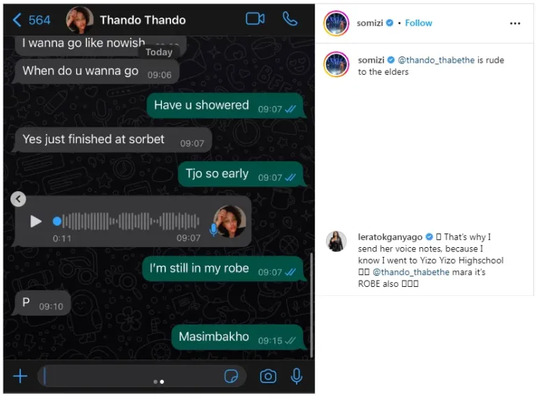 After Somizi shared it on Instagram, Lerato Kganyago agreed with Somizi that Thando Thabethe was rude.
